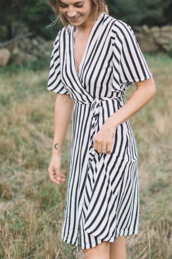 black and white striped wrap dress