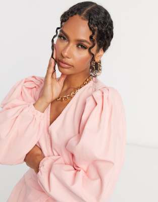 ASOS DESIGN denim wrap puff sleeve mini light pink dress asos