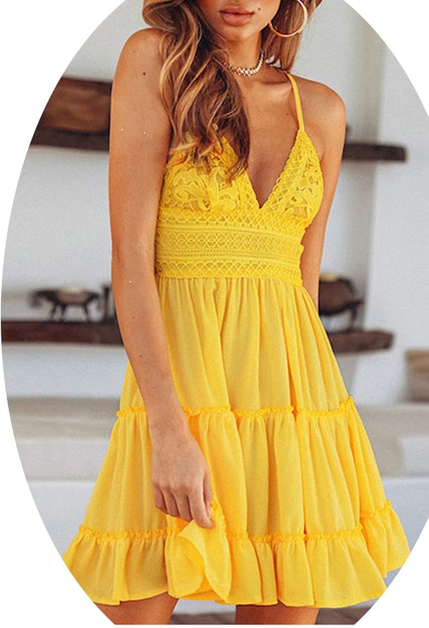 Summer Lace Dress Backless V yellow lace sundress