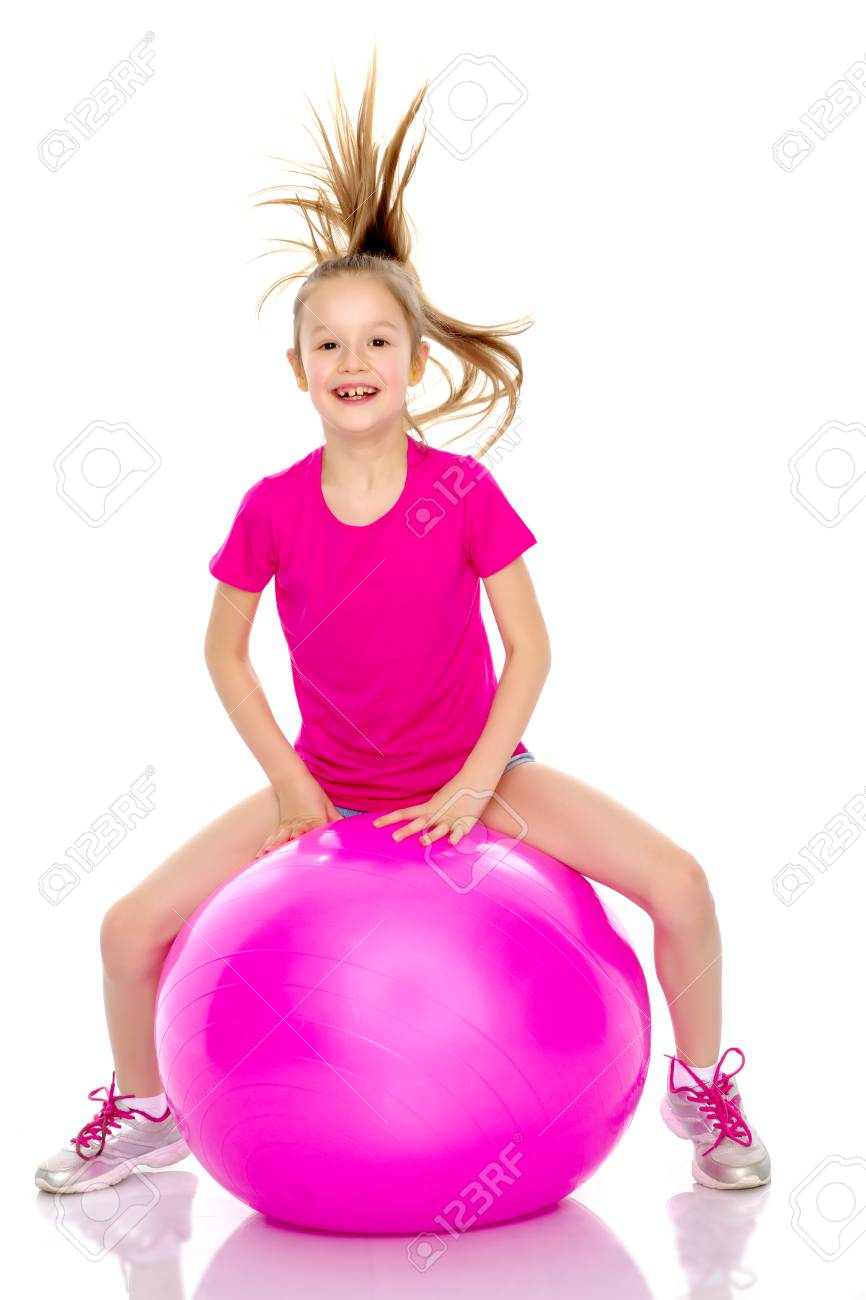 little girl is jumping on a big ball big gym ball