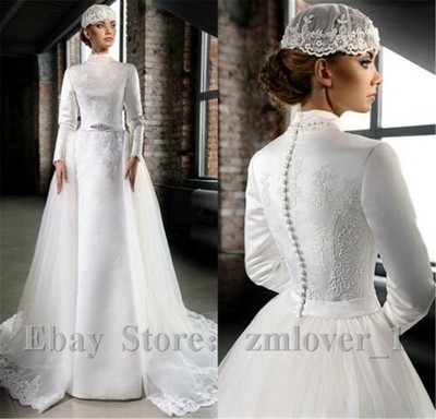 Muslim Wedding Dress Long Sleeve Satin lace back wedding dress with buttons