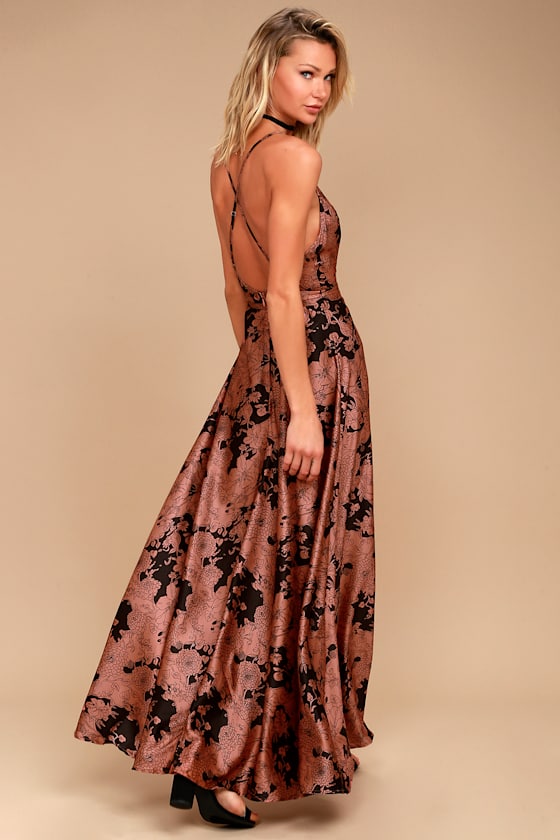 Satin Maxi Dress - Floral Print Maxi tea gardens rusty rose floral print satin maxi dress