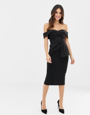 asos design bardot fold wrap front midi pencil dress