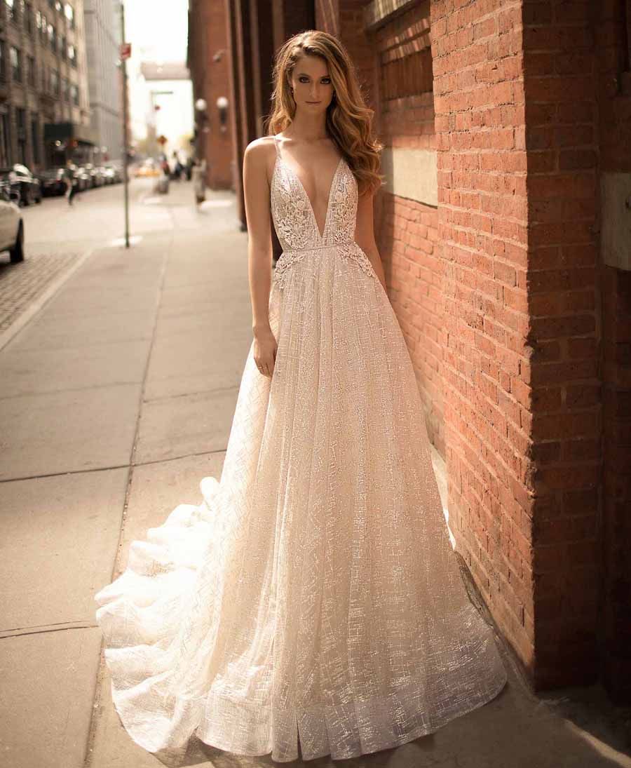 F201013 V-neck Sequin Lace \u0026 Silky sequin lace wedding dress