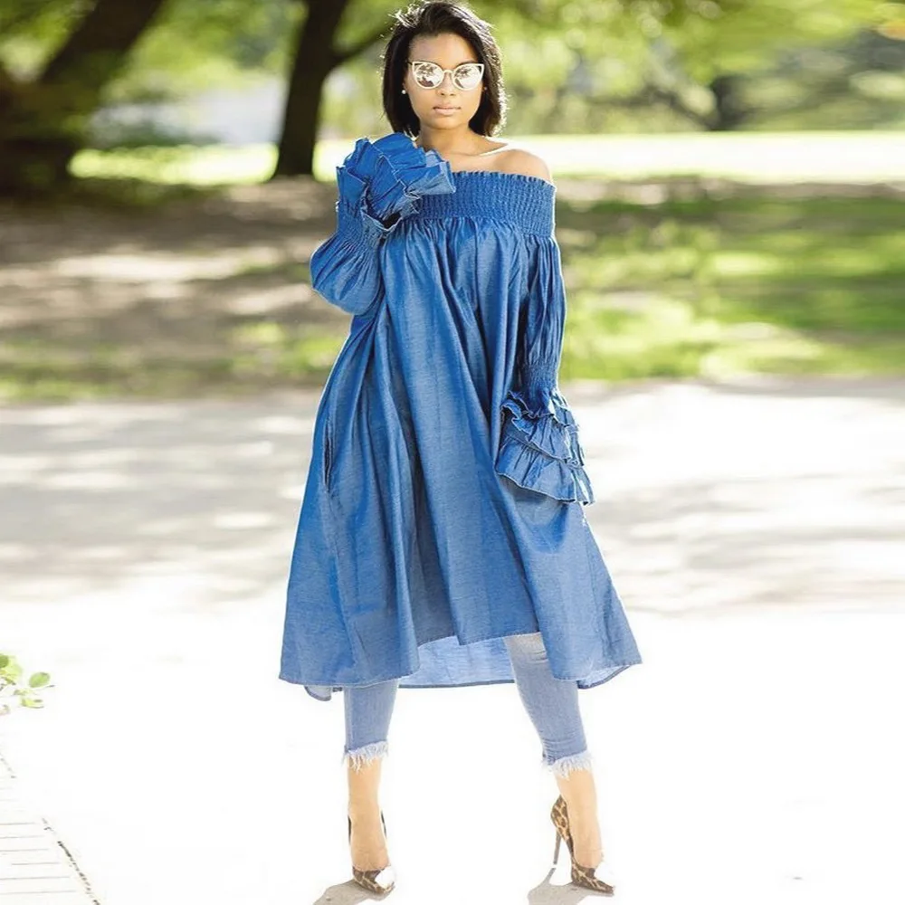 OKAYOASIS Sexy Women Slash Neck Long oasis denim slash neck dress