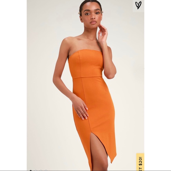 Lulus Jazzie Burnt Orange Strapless orange strapless bodycon dress