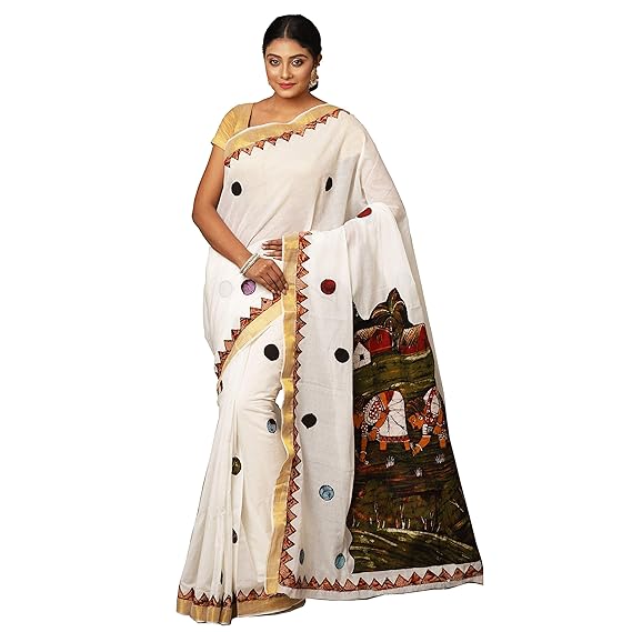 Buy Hastamev Golden White Gram Bari ladies cotton sarees
