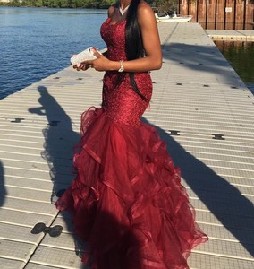 Burgundy mermaid dress with ruffles at mermaid dress with ruffles at the bottom
