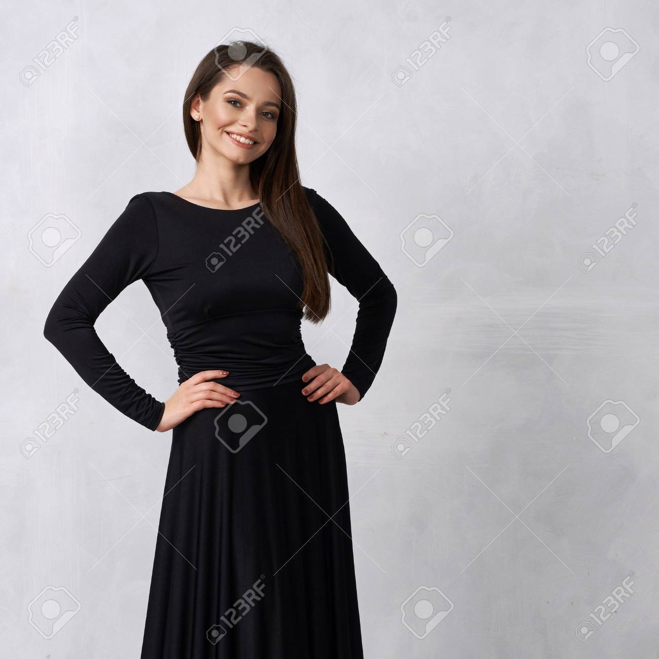 Long Brunette Hair Dressed elegant black maxi dress