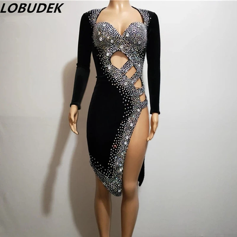 Sexy Hollow Out Rhinestones Black Latin backless slit dress