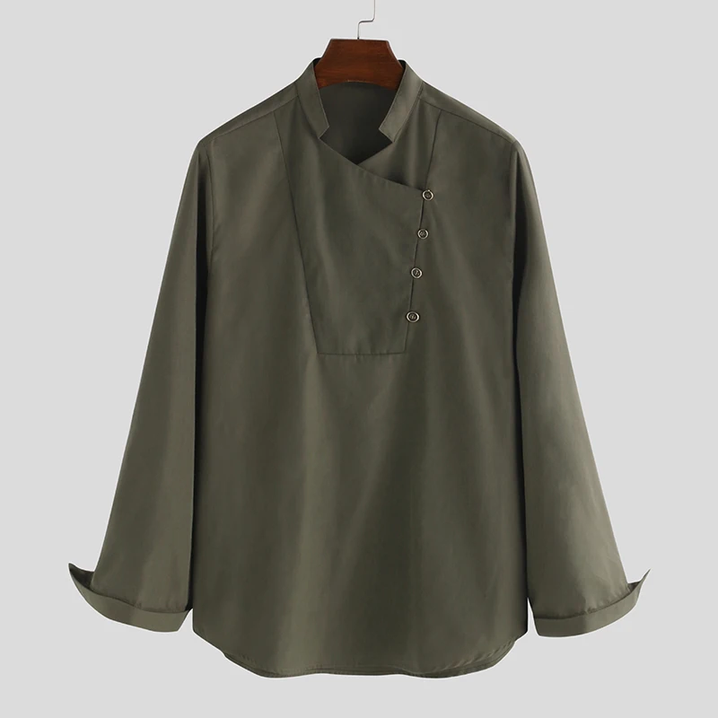 Mens Indian Retro Shirts Man Stand mens vintage solid color stand collar long sleeve loose casual t shirt