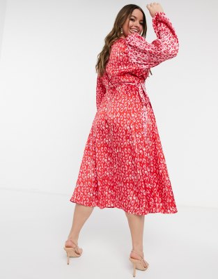 long sleeve wrap tie satin midi dress leopard spot dress