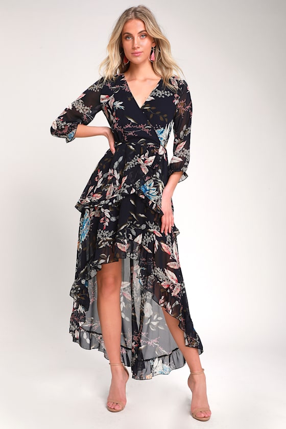 Cute Navy Blue Floral Dress - High-Low fiorire slate blue floral print wrap maxi dress