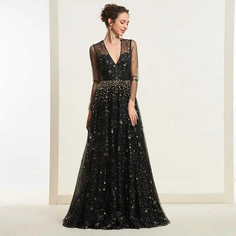 Black Sequin Lace Slim A-line Long black sequin a line dress