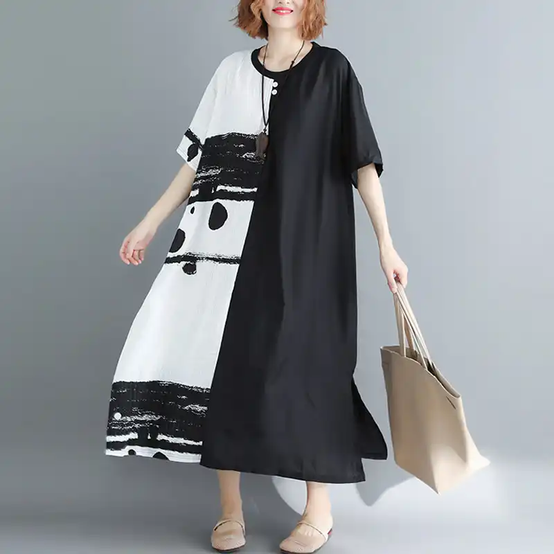 Women Chinese Style Dress Short Sleeve black and white linen dress