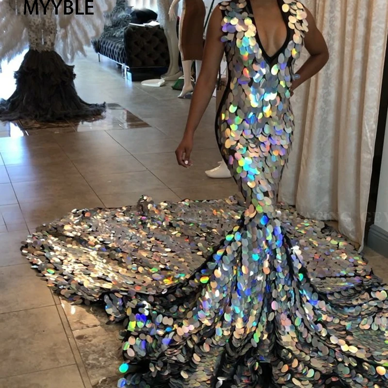 Long Train Silver Mermaid Prom Dress sparkly prom dresses plus size
