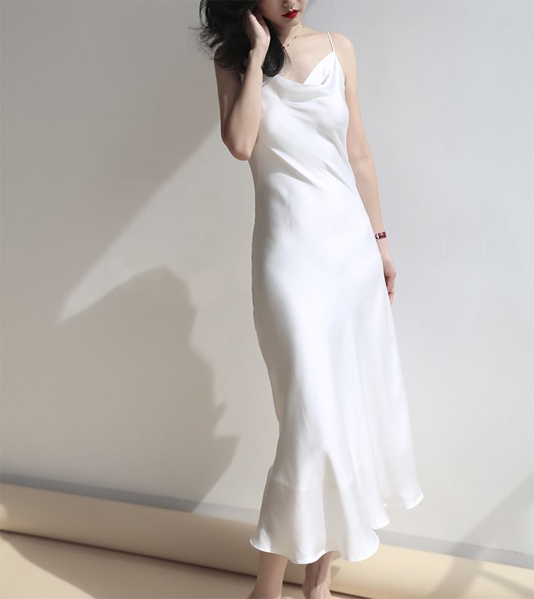 2020 Summer Dress Women Long Satin Slip white silk spaghetti strap dress